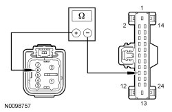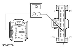 - Measure the resistance between RH front window motor C623-6, circuit CPW73 (GN/VT), harness side and BCM-B (Body Control Module B) C4368A-22, circuit CPW73 (GN/VT), harness side.