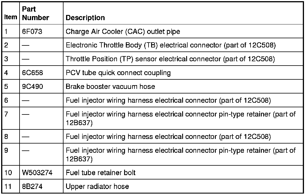 24. NOTICE: The compression limiter bushing may fall out of the mounting bracket grommet on the Charge Air Cooler (CAC) tube during service. Make sure the bushing is in place when reinstalling the tube or damage to the tube may occur.