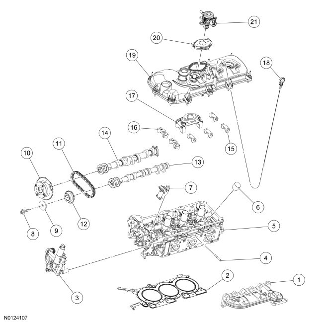 48. NOTE: Cylinder head camshaft bearing caps are numbered to verify that they are assembled in their original positions.