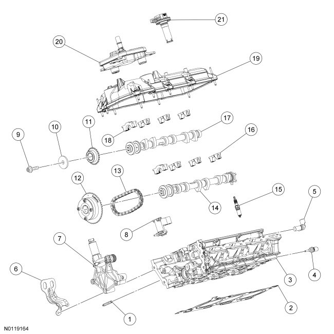 55. Assemble the RH Variable Camshaft Timing (VCT) assembly, the RH exhaust camshaft sprocket and the RH secondary timing chain.