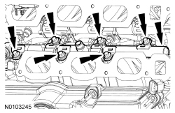 - Push down on the fuel rail face above the injectors and begin tightening the outer bolts first and proceed inward.