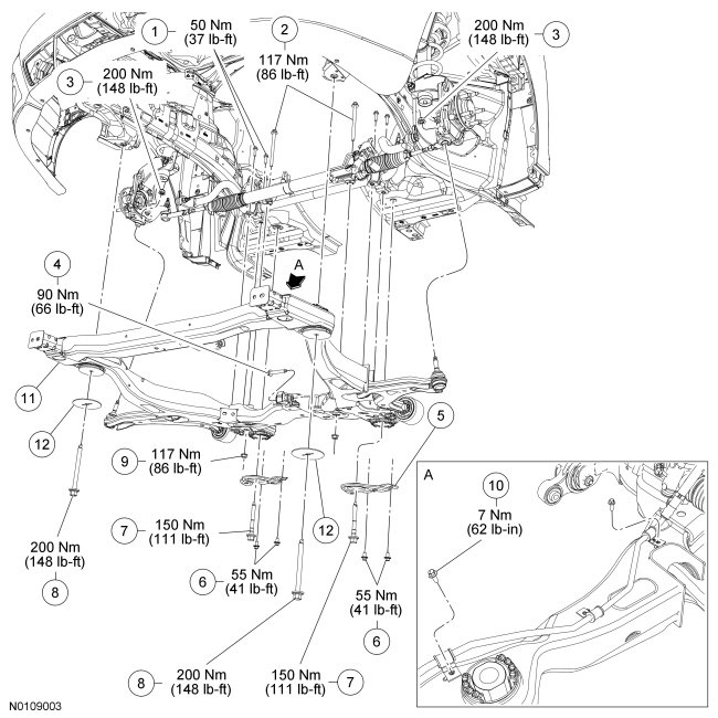 Tighten the 4 new subframe bracket-to-body bolts to 55 Nm (41 lb-ft).