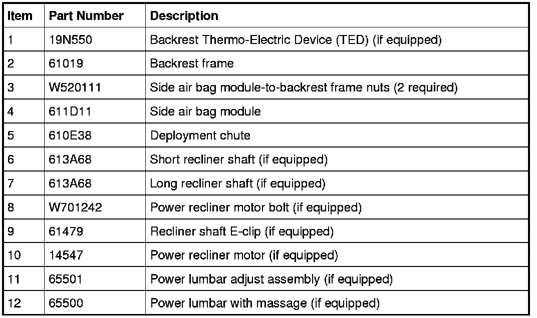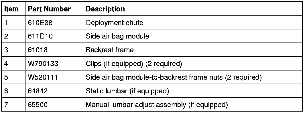 NOTE: If a side air bag deployment took place, a new seat backrest foam pad, backrest trim cover, deployment chute and side air bag module and nuts must be installed. The seat backrest frame should be replaced if necessary.