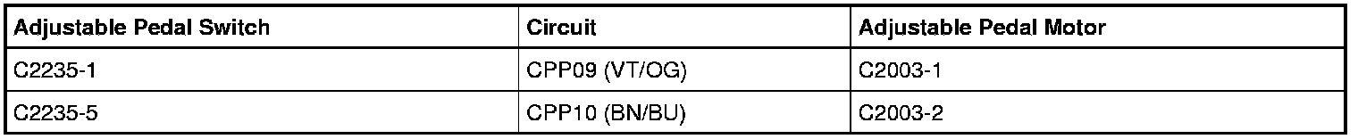 - Measure the resistance between adjustable pedal switch C2235, harness side and adjustable pedal motor C2003, harness side as indicated in the following chart: