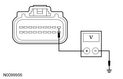 - Measure the voltage between the C-CM (Cruise-Control Module) C1582-1, circuit SBB13 (GY/RD), harness side and ground.
