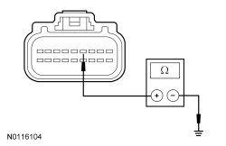 - Measure the resistance between the C-CM (Cruise-Control Module) C1582-4, circuit GD120 (BK/GN), harness side and ground.