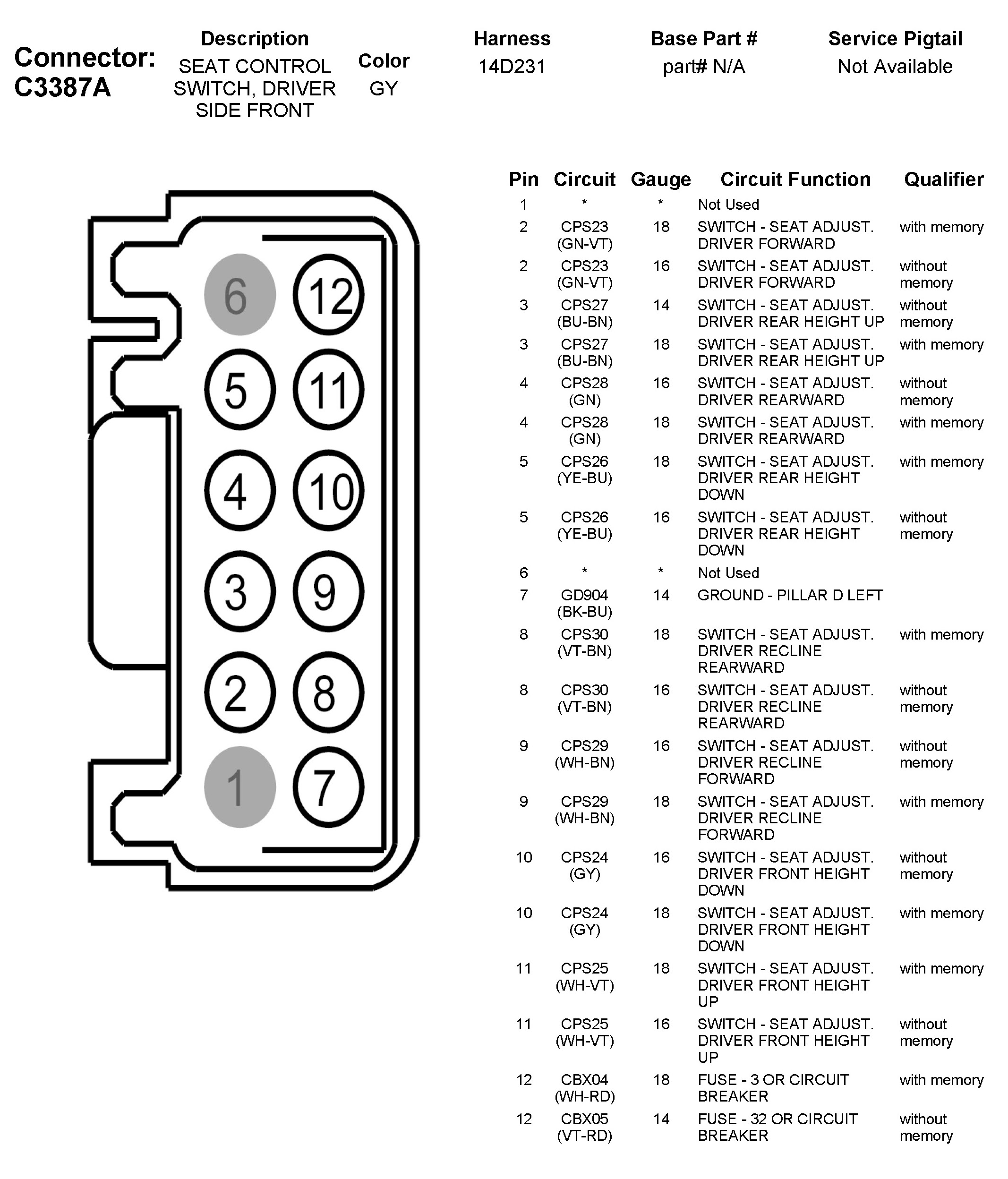 C3387A Seat Control Switch, Driver Side Front