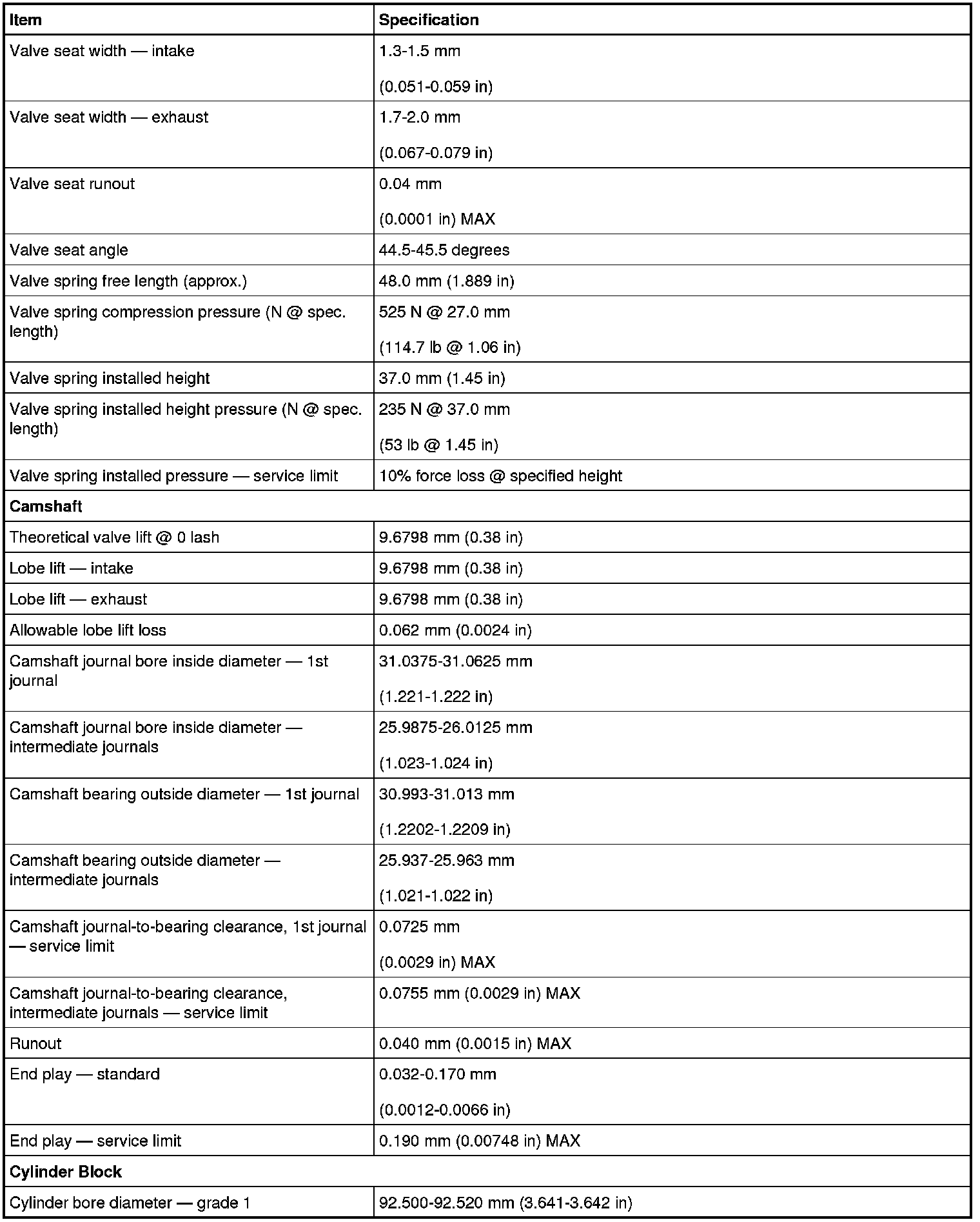 Camshaft Gear/Sprocket Specifications