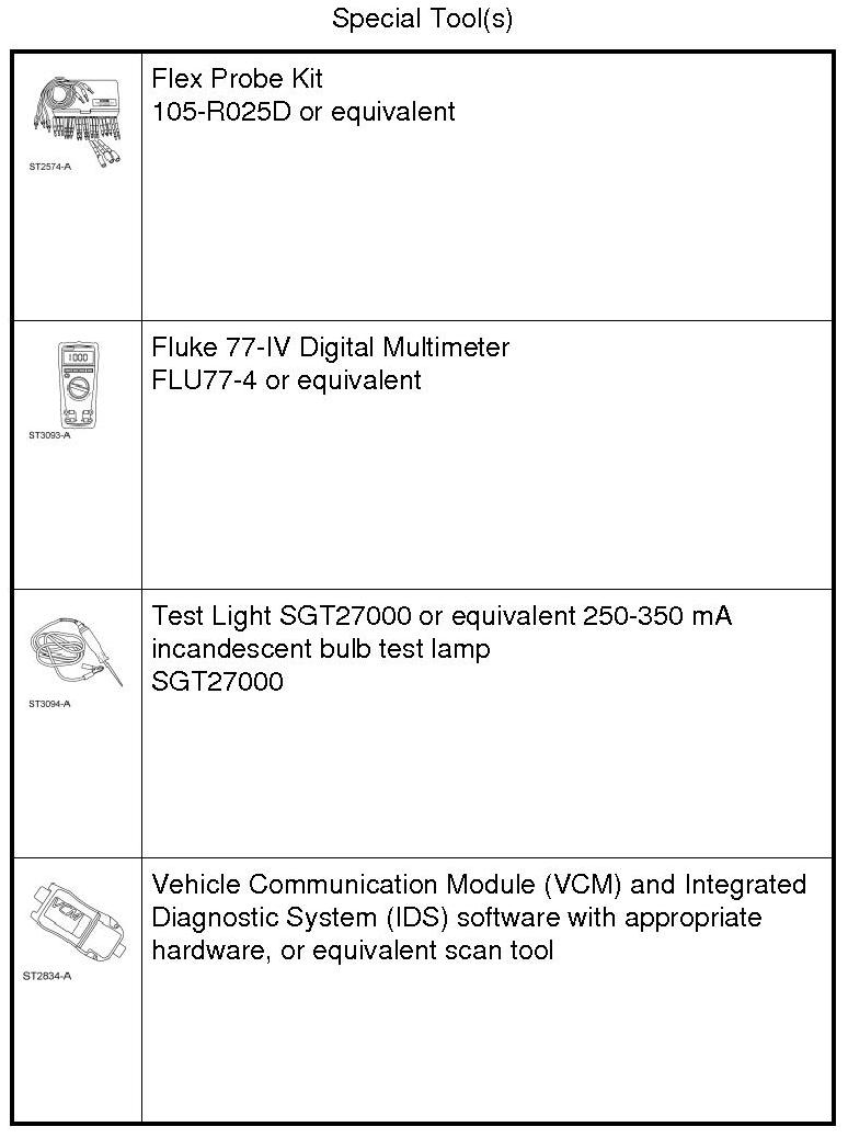 NOTE: The following step uses a test light to simulate normal circuit loads. Use only the test light recommended in the Special Tools table at the beginning. To avoid connector terminal damage, use the Flex Probe Kit for the test light probe connection to the vehicle. Do not use the test light probe directly on any connector.