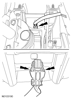 5. NOTE: The collapsible steering column module electrical connector locking tabs are not clearly visible. Using an inspection mirror may help in viewing the electrical connector locking tabs clearly.