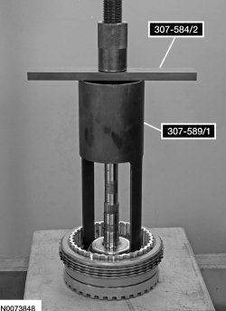 Install the Overdrive Clutch, Balance Piston and Direct Clutch Compressor 307-589/2 and the Forward/Intermediate Spring Compressor 307-584/2 on the direct clutch cylinder. Using a press, compress the direct clutch piston return spring and install the snap ring.