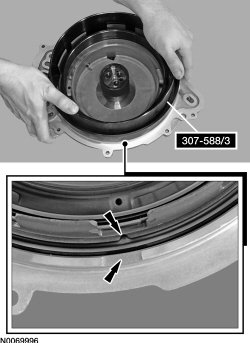 Compress the low/reverse piston return spring, install the snap ring and remove the Forward/Intermediate Spring Compressor 307-584/2 and the Reverse Clutch Piston and Retaining Ring Set 307-588/3.