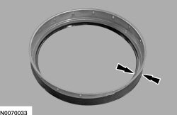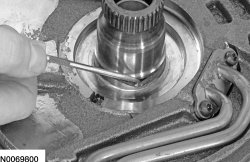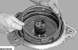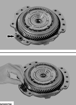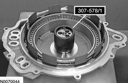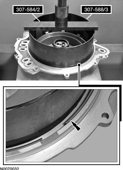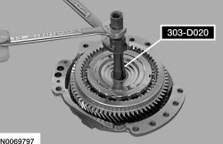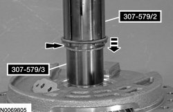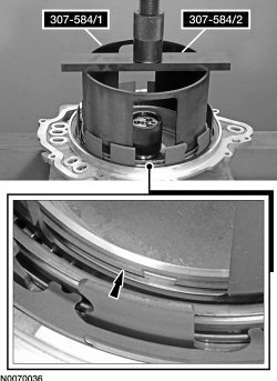 Install the Forward/Intermediate Spring Compressor 307-584/1 and 307-584/2. Using a press, compress the intermediate clutch piston return spring, install the snap ring and remove the Forward/Intermediate Spring Compressor 307-584/1 and 307-584/2.