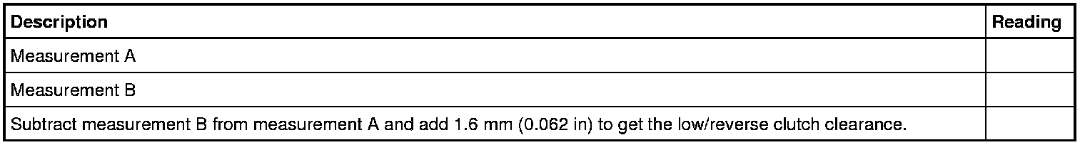 256. Subtract measurement B from measurement A and add 1.6 mm (0.062 in), to compensate for the thickness of the gasket, to get the low/reverse clutch clearance. The clearance should be between 1.01 mm (0.039 in) and 2.47 mm (0.097 in). If the clearance is out of range, check the low/reverse clutch pack for correct installation. If the low/reverse clutch pack is correctly installed, install a new low/reverse clutch pack.
