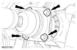 13. NOTICE: Use only the specified bolts for the torque converter. Standard length fasteners may bottom out and damage the torque converter clutch apply surface.