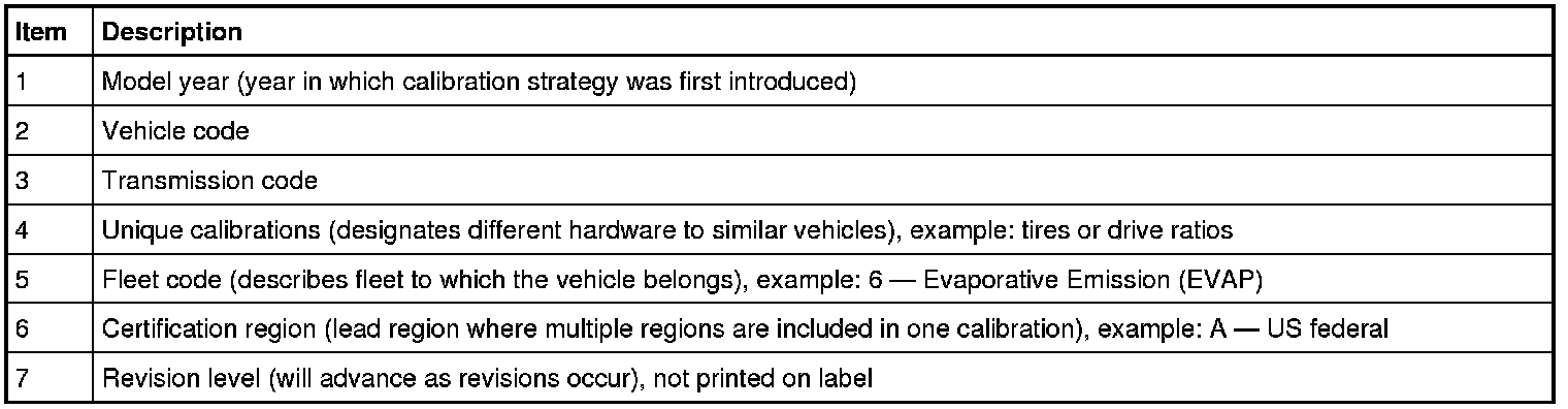 NOTE: Powertrain calibration information is limited to a maximum of 5 characters per line on the Vehicle Certification (VC) Label. Because of this, calibration identification consisting of more than 5 characters will wrap to the second line on the VC (Vehicle Certification) label.