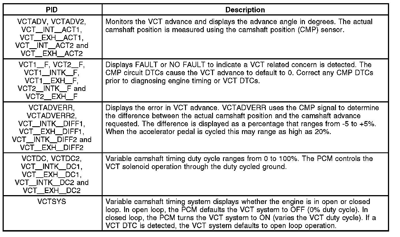 The PCM calculates and determines the desired camshaft position. It continually updates the VCT solenoid duty cycle until the desired position is achieved. A difference between the desired and actual camshaft position represents a position error in the PCM VCT control loop. The PCM disables the VCT and places the camshaft in a default position if a concern is detected. A related DTC also sets when the concern is detected.