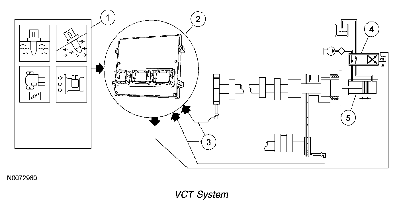 1. The PCM receives input signals from the intake air temperature (IAT), engine coolant temperature (ECT), CMP, throttle position (TP), mass airflow (MAF), and CKP sensors to determine the operating conditions of the engine. At idle and low engine speeds with closed throttle, the PCM controls the camshaft position based on engine coolant temperature, engine oil temperature, intake air temperature, and mass airflow. During part and wide open throttle, the camshaft position is determined by engine RPM, load and throttle position. The VCT system does not operate until the engine is at normal operating temperature.