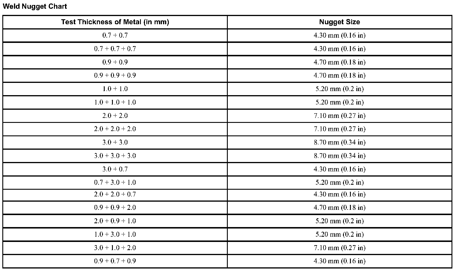 Weld Nugget Chart