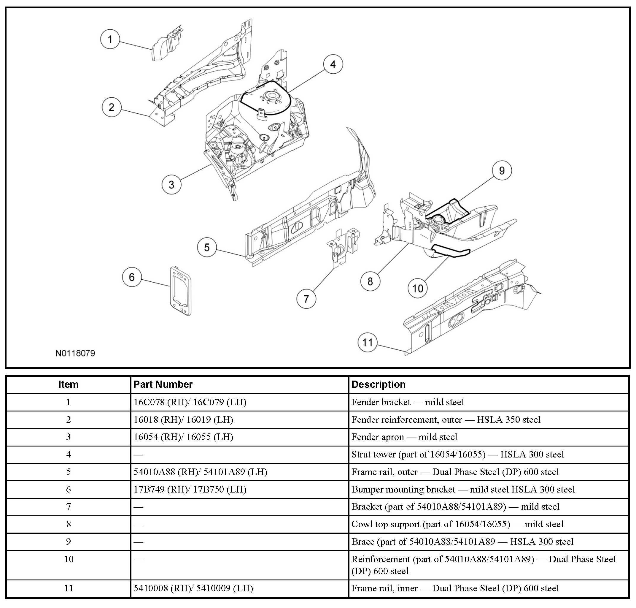 NOTE: Right side fender reinforcements and apron shown, left side similar.