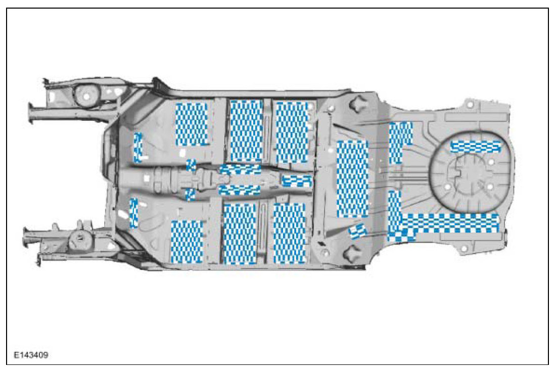 NOTE: The following illustration serves as a reference to indicate mastic patch (butyl) locations. Additional insulators and sound deadeners are used beyond those indicated in the illustration.