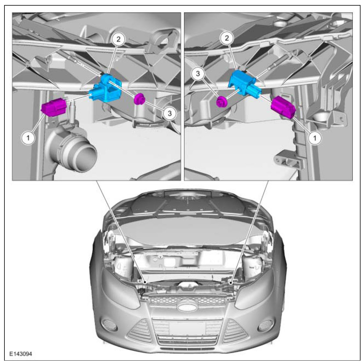 5. Remove the front impact severity sensor nut, disconnect the electrical connector and remove the front impact severity sensor.