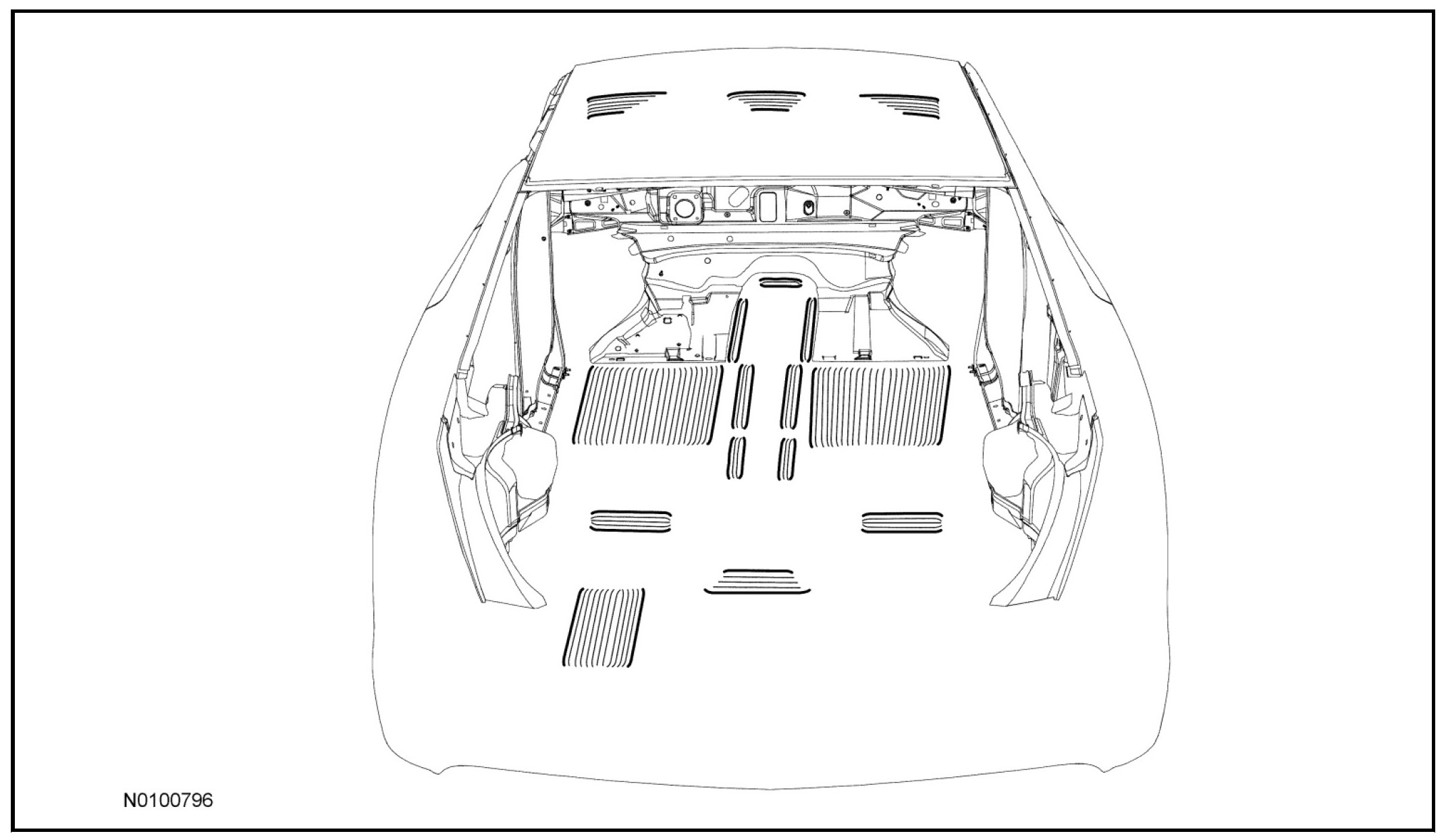- The following illustrations serve as a reference to indicate mastic sound deadener locations. Additional insulators and sound deadeners may be used beyond those indicated in the illustration.