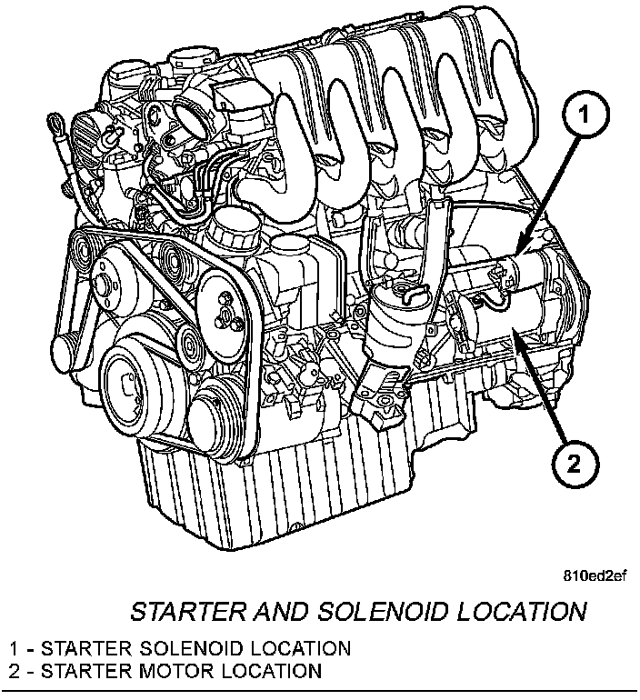 The starter motor and solenoid assembly is located at the left/rear side of engine.
