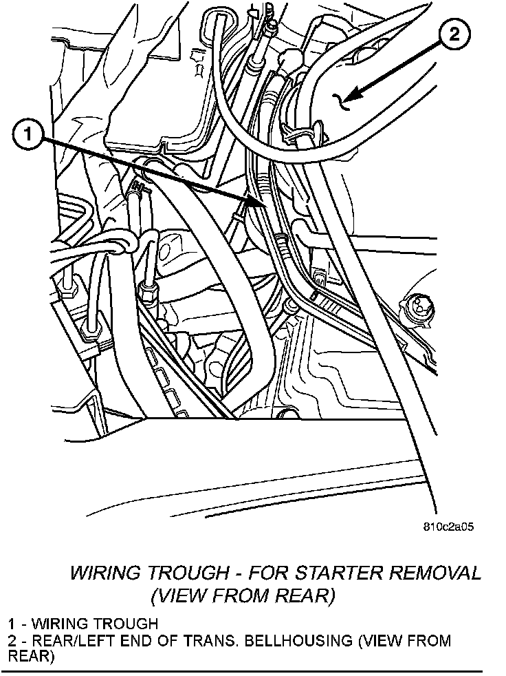 2. Working from under vehicle hood, remove bolt retaining wiring trough to transmission bellhousing.