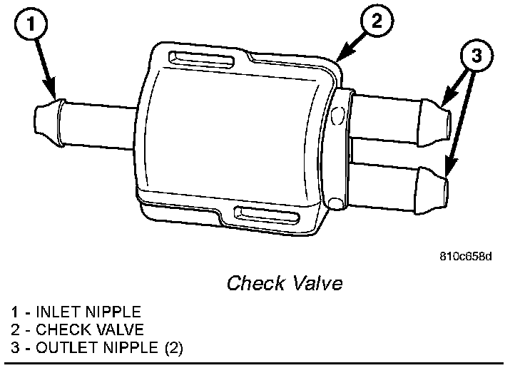 A single washer system check valve is standard equipment on this model, and is installed in the washer system plumbing. The check valve is integral to the washer plumbing fitting located on the underside of the cowl top panel behind the rear of the hood panel opening in the engine compartment. The check valve consists of a molded plastic body with three barbed hose nipples, one at the inlet side of the valve body and two at the outlet side. The check valve cannot be adjusted or repaired and, if faulty or damaged, it must be replaced.