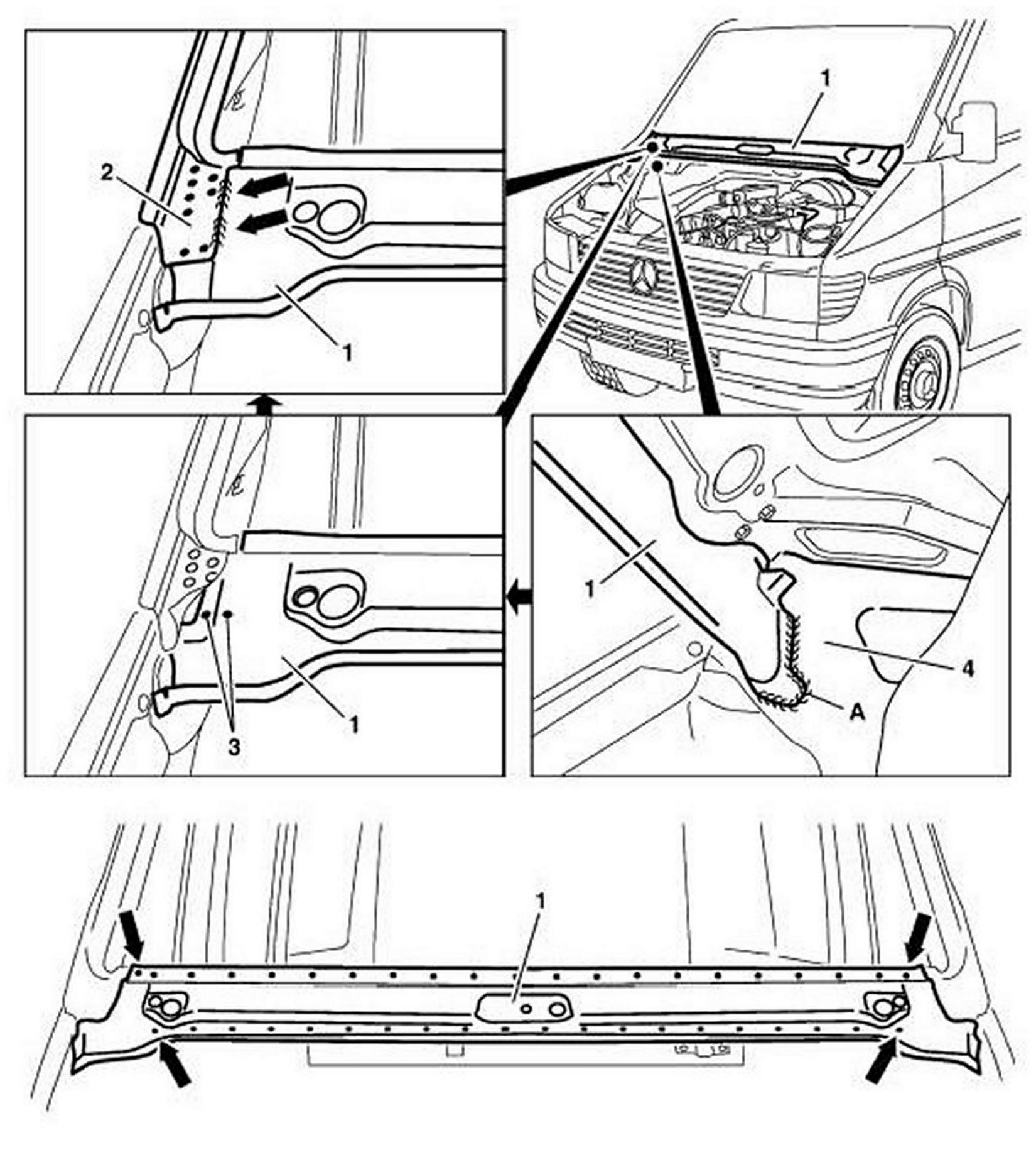 1. Weld waist rail paneling (1) to A-pillar inner section (4) (A).