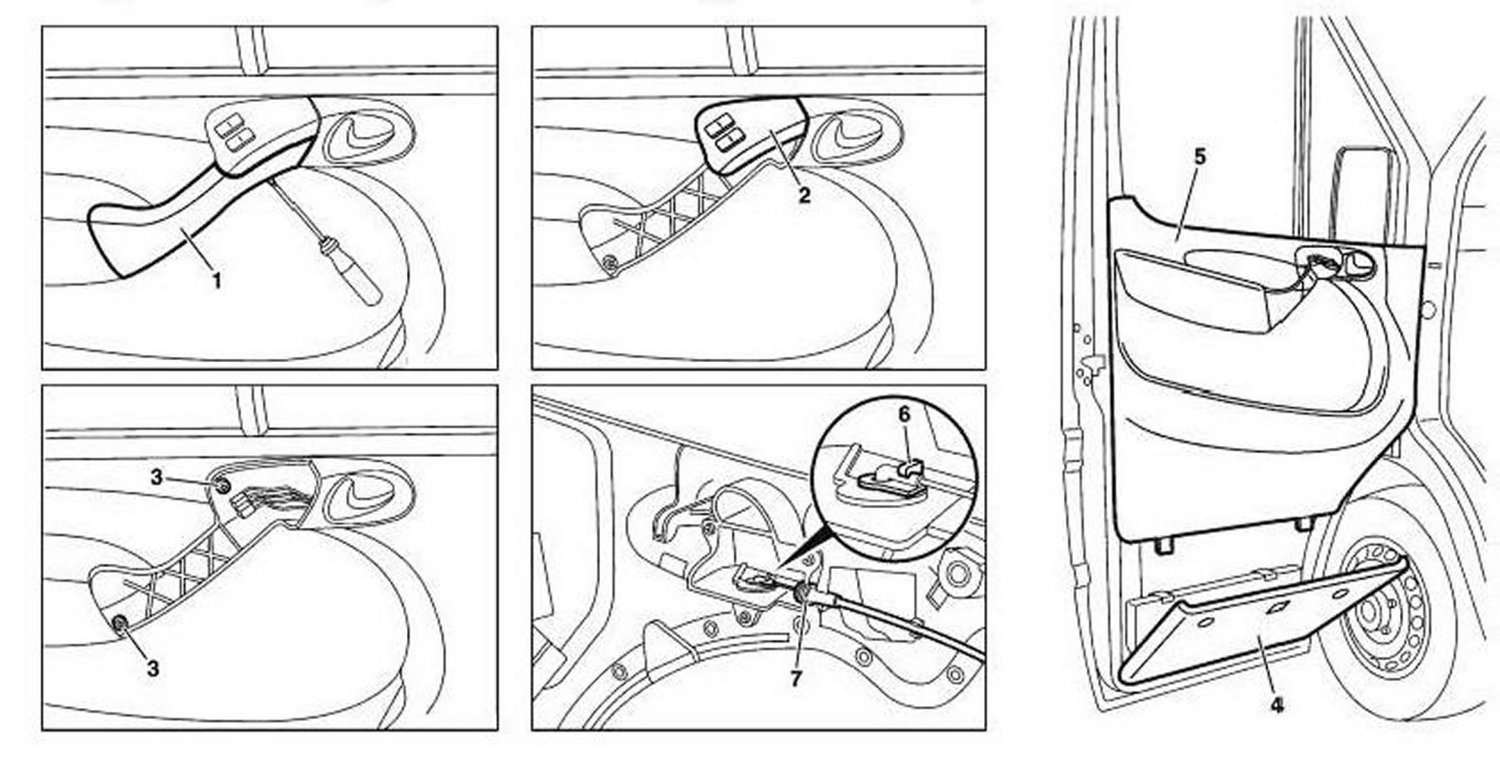 6. Unlock retainer (6) and unclip pull wire (7) from door opening lever and door paneling