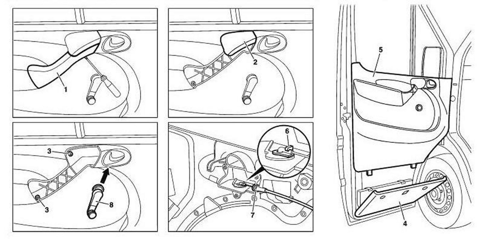 5. Slightly pull door paneling (5) upward and swing away slightly The door opening lever is still connected with the control cable (7)