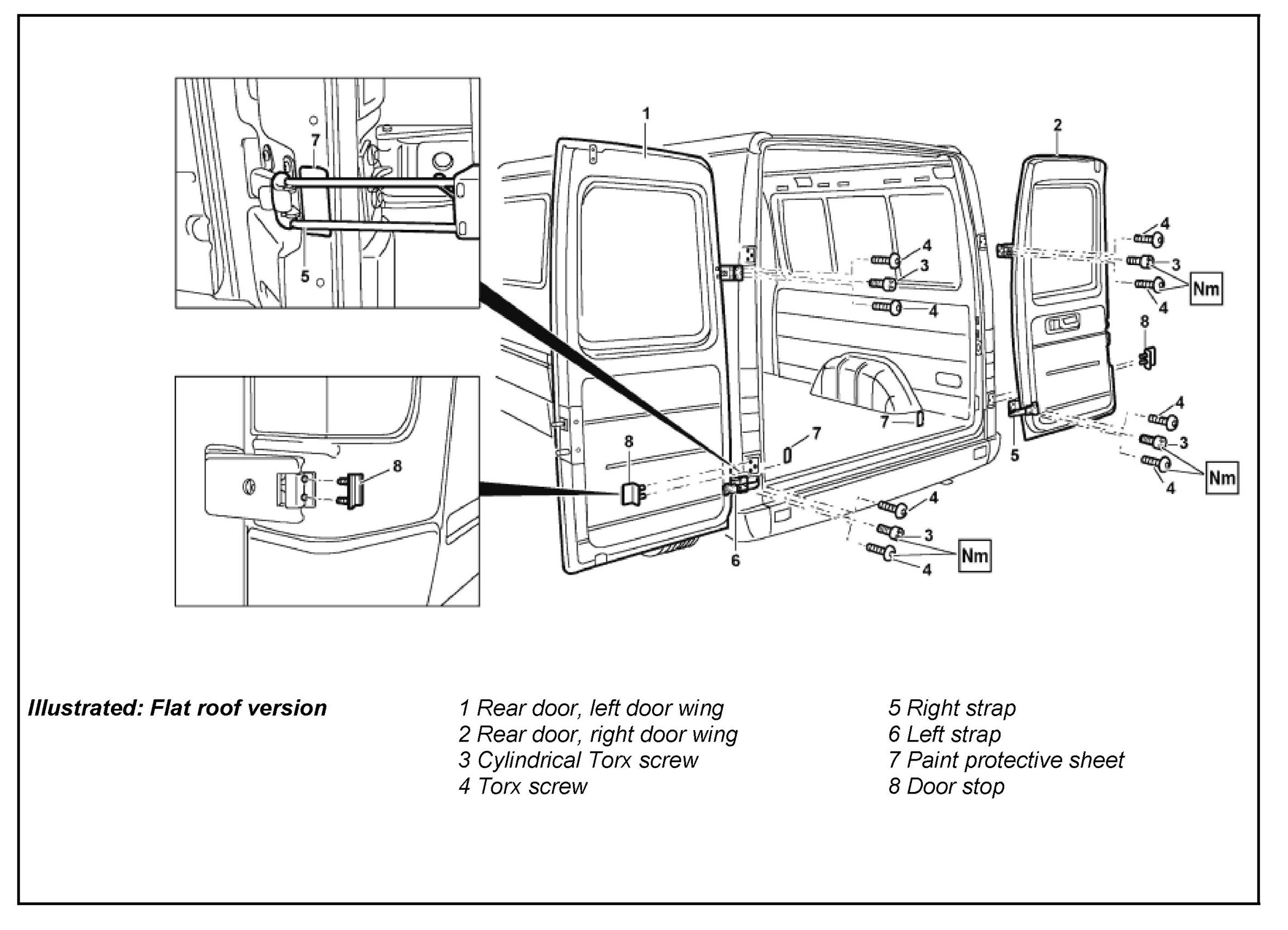 1 Inspect door stop (8) on both door hinges replace if necessary