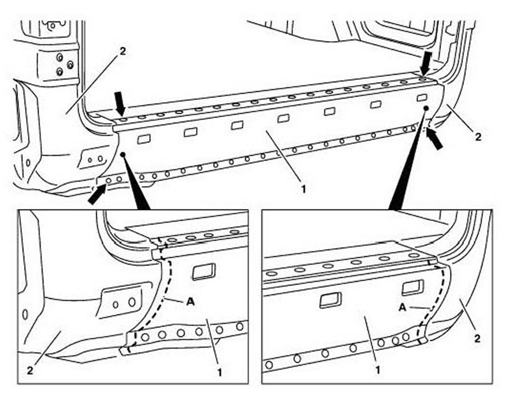 2 Separate end plate (1) along both corner pillar panels (2) (dotted line, A).