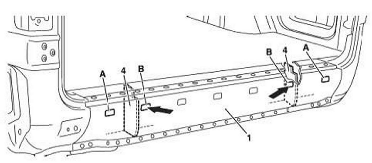 Screw screws into towing hook mount on right side, to keep glue off of threads When replacing end cross member new sealing plates (4) are not delivered, therefore completely foam area between opening A and B.