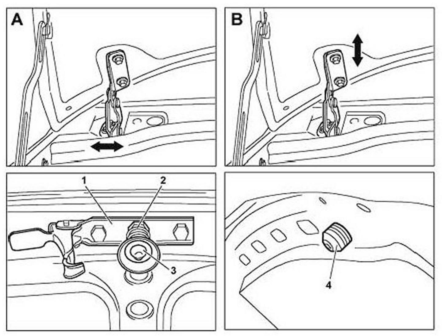 2. Adjust hood depth and flushness in relation to fender By moving engine hood (B) vertically.