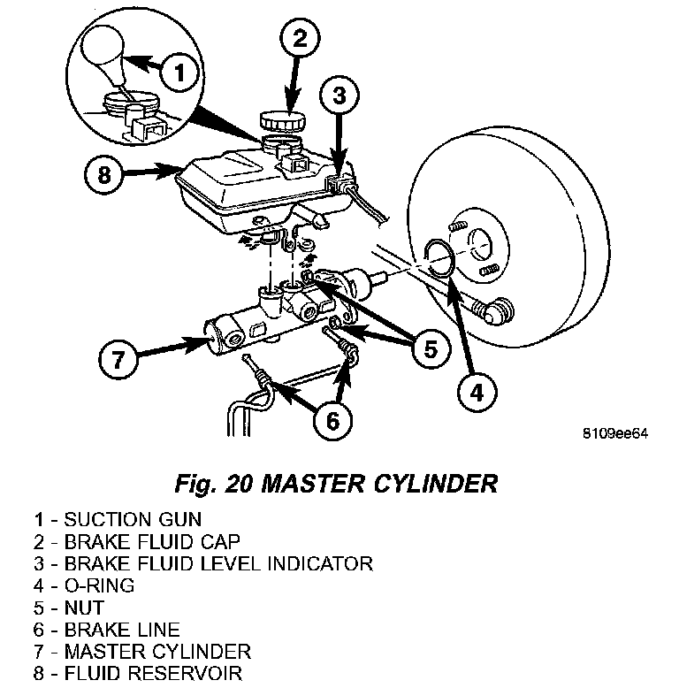 4. Remove the master cylinder mounting nuts (Fig. 20) or (Fig. 21). Check brake booster for damage due to leaking master cylinder. It is not possible to repair the master cylinder.
