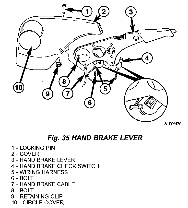 6. Disconnect the hand brake check switch and wiring harness from the hand brake lever (Fig. 35).