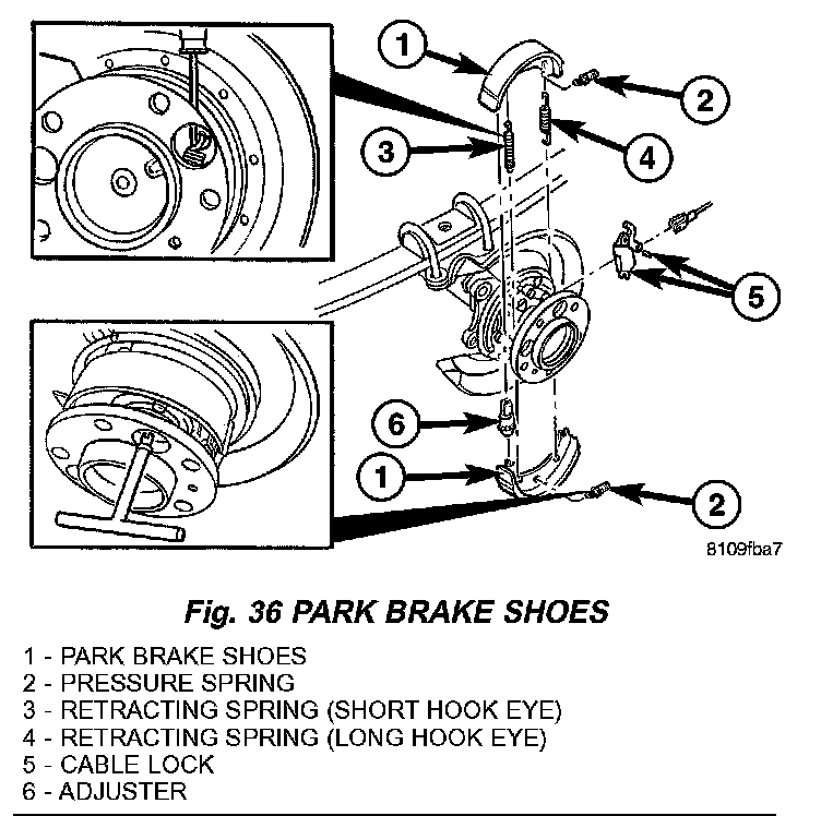 8. Remove the rear park brake shoes (Fig. 36). Pull the park brake shoes apart at the bottom and remove them together with the adjuster.