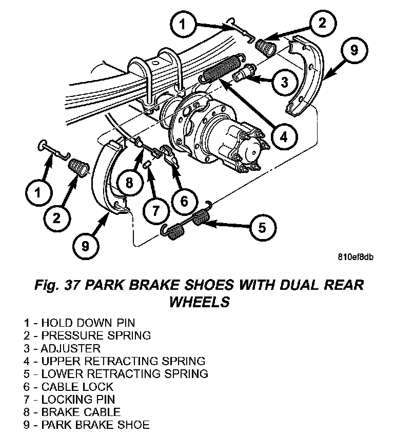 1. Ensure that the cable lock moves easily before installing shoes. Install the park brake shoes.