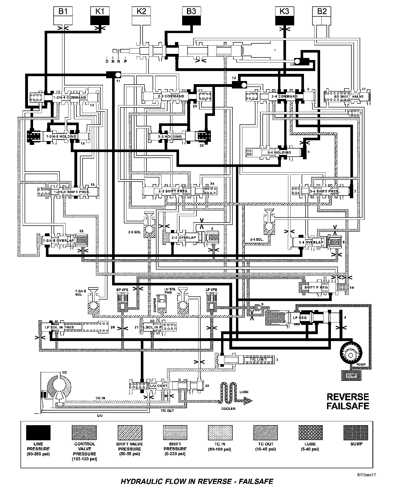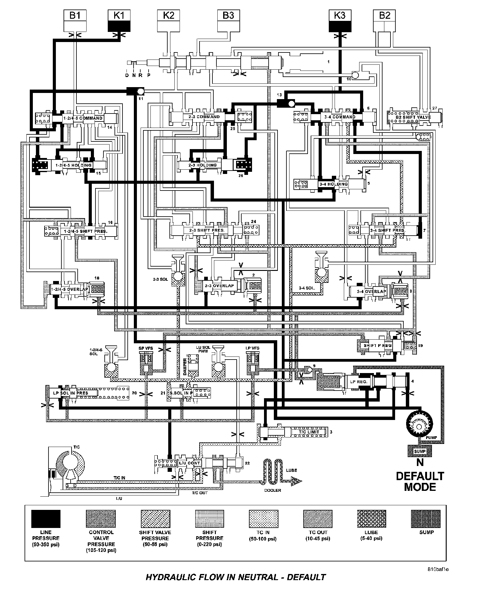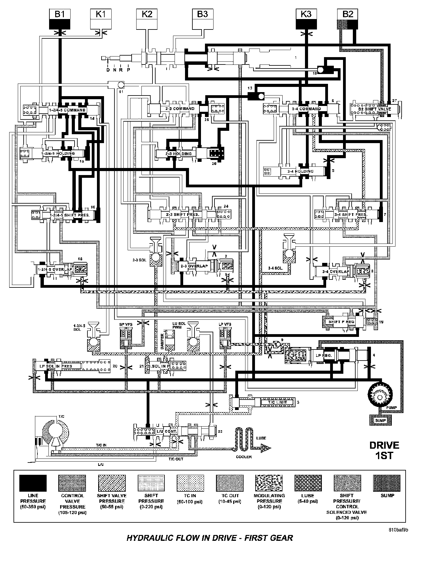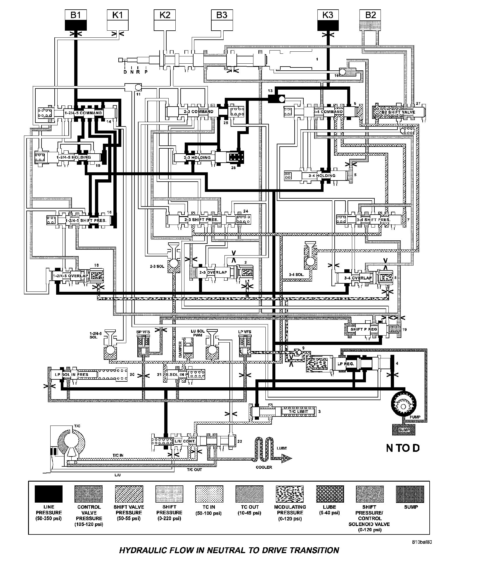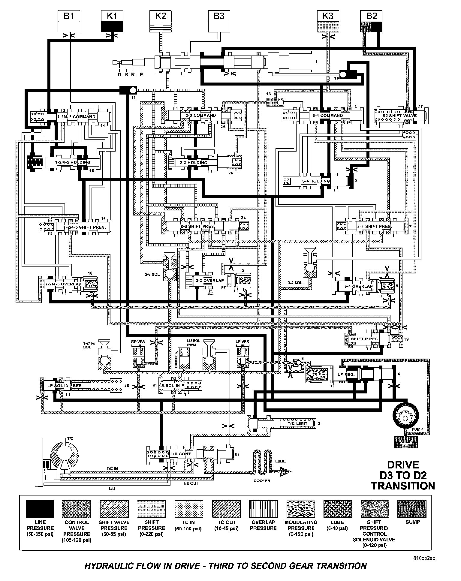 HYDRAULIC FLOW IN DRIVE - SECOND TO FIRST GEAR TRANSITION