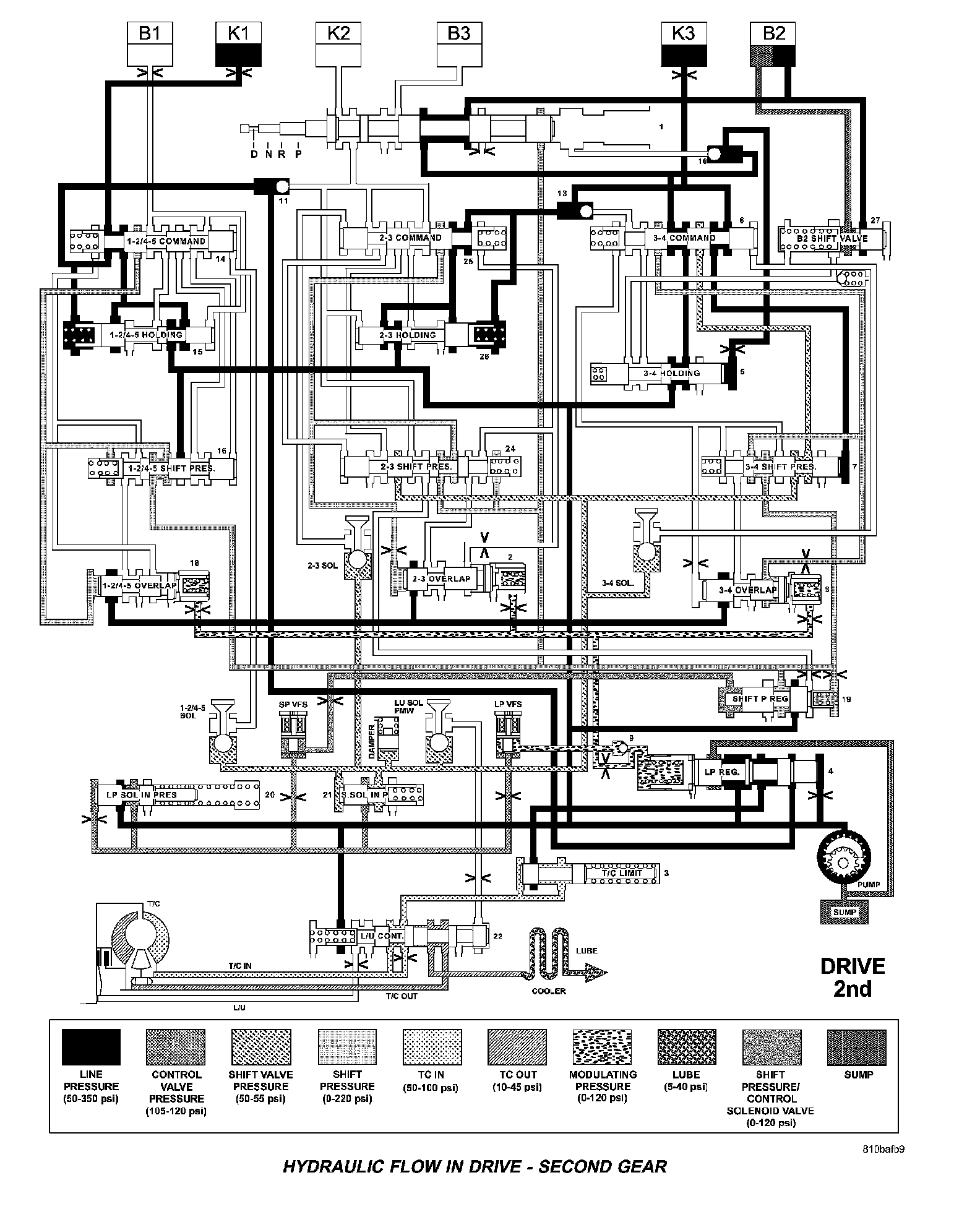 HYDRAULIC FLOW IN DRIVE - FIRST TO SECOND GEAR TRANSITION