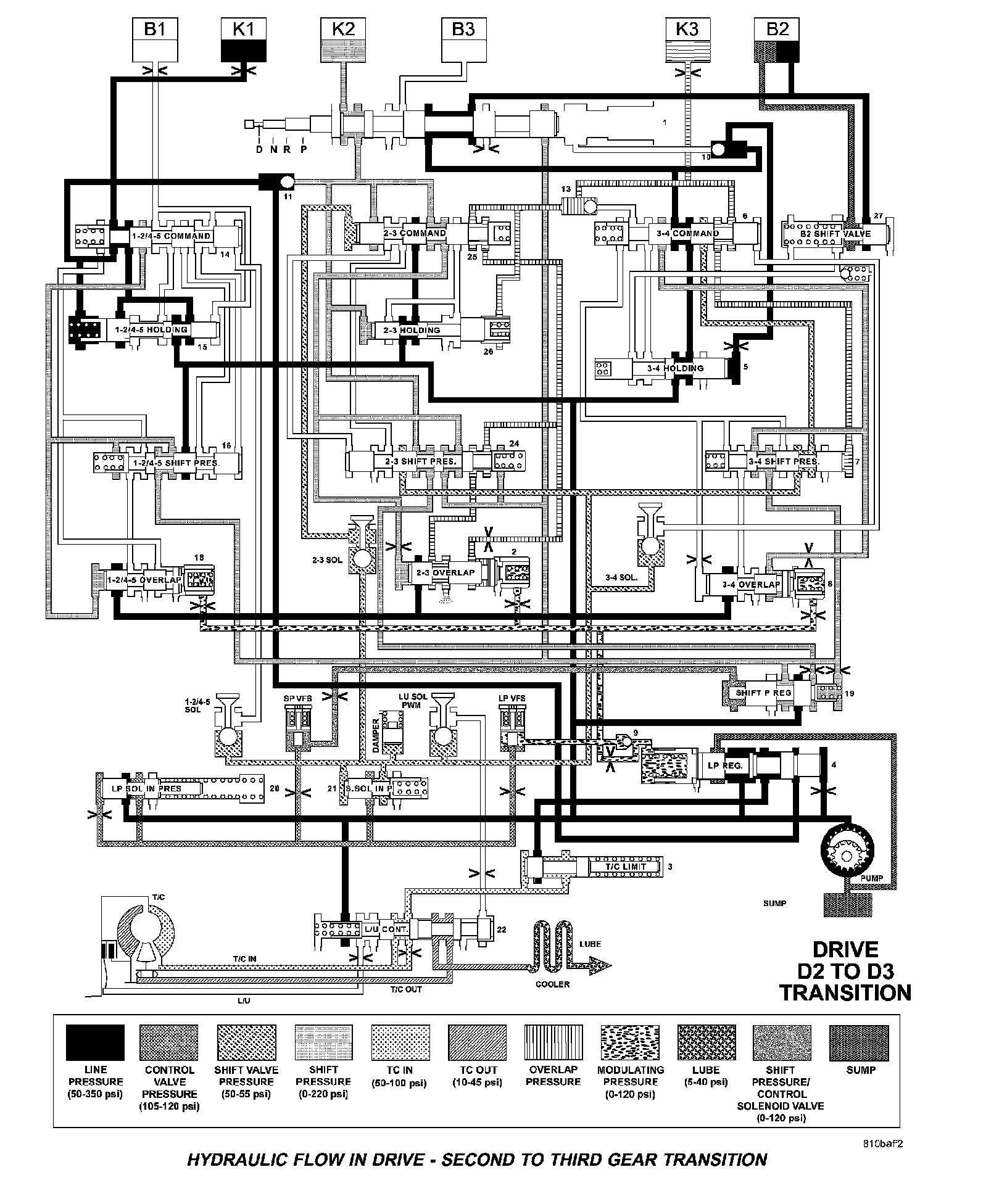 HYDRAULIC FLOW IN DRIVE - SECOND TO THIRD GEAR TRANSITION