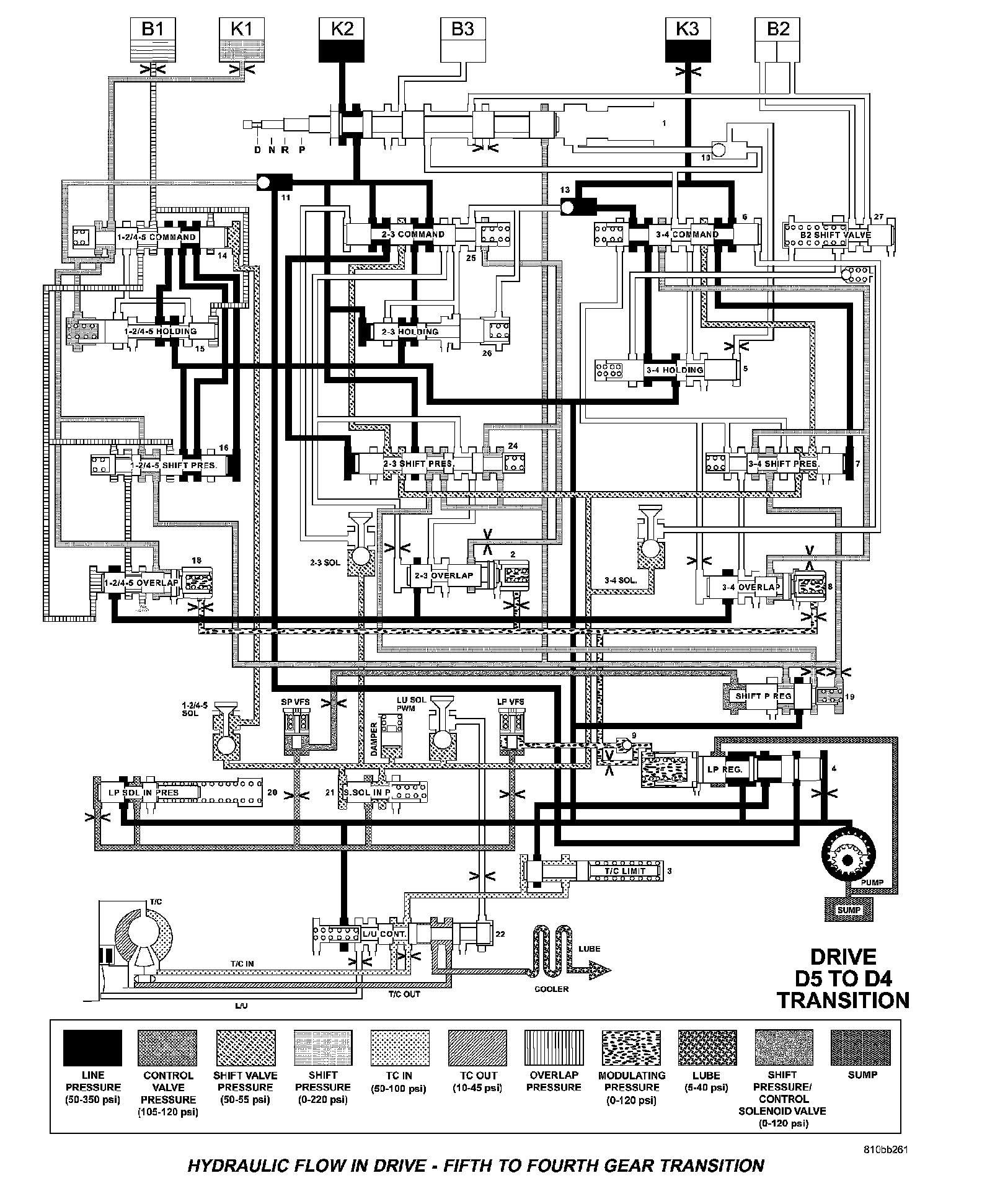 HYDRAULIC FLOW IN DRIVE - FIFTH TO FOURTH GEAR TRANSITION