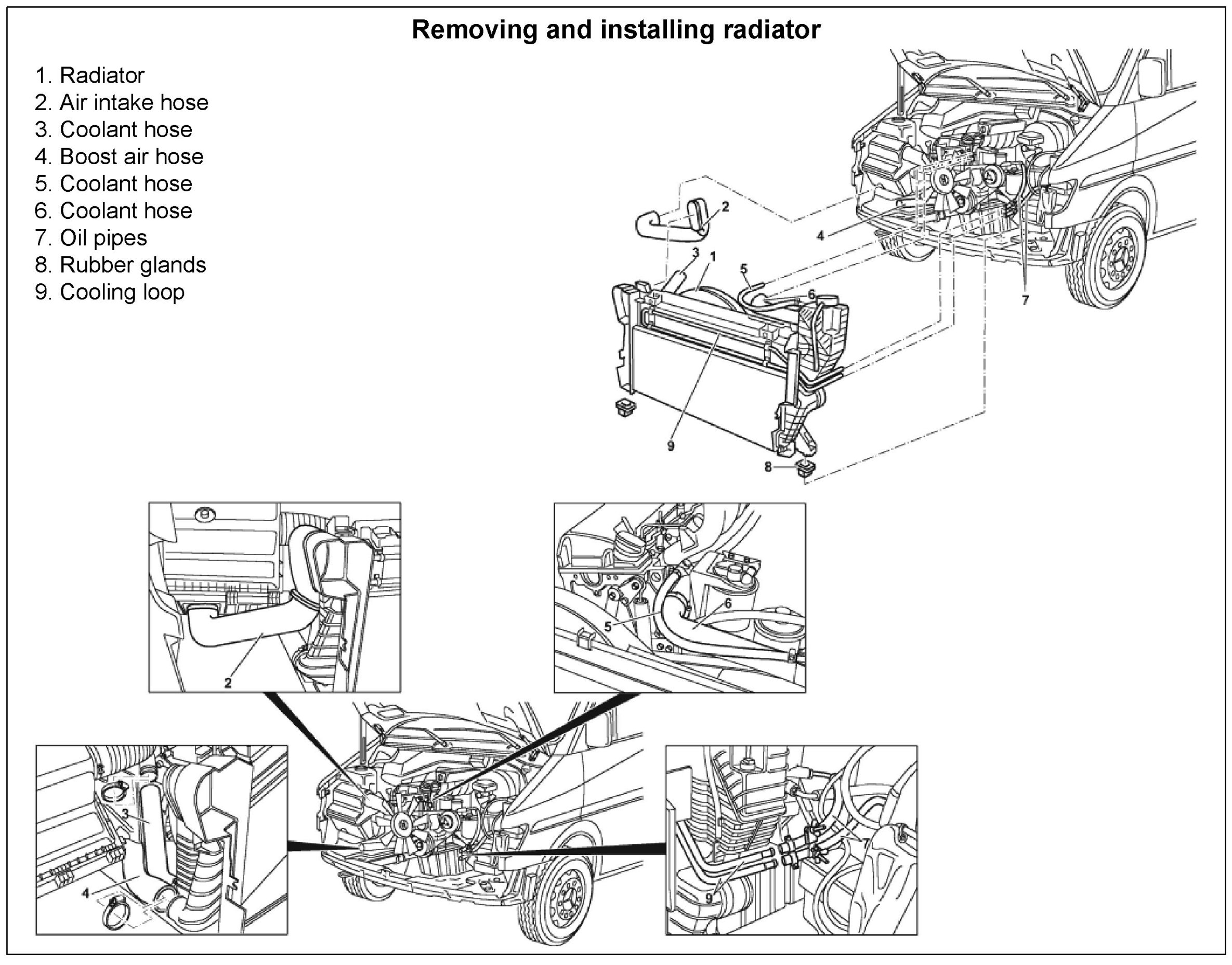 5. Pinch off oil pipes (7), slacken at the cooling loop (9) and detach