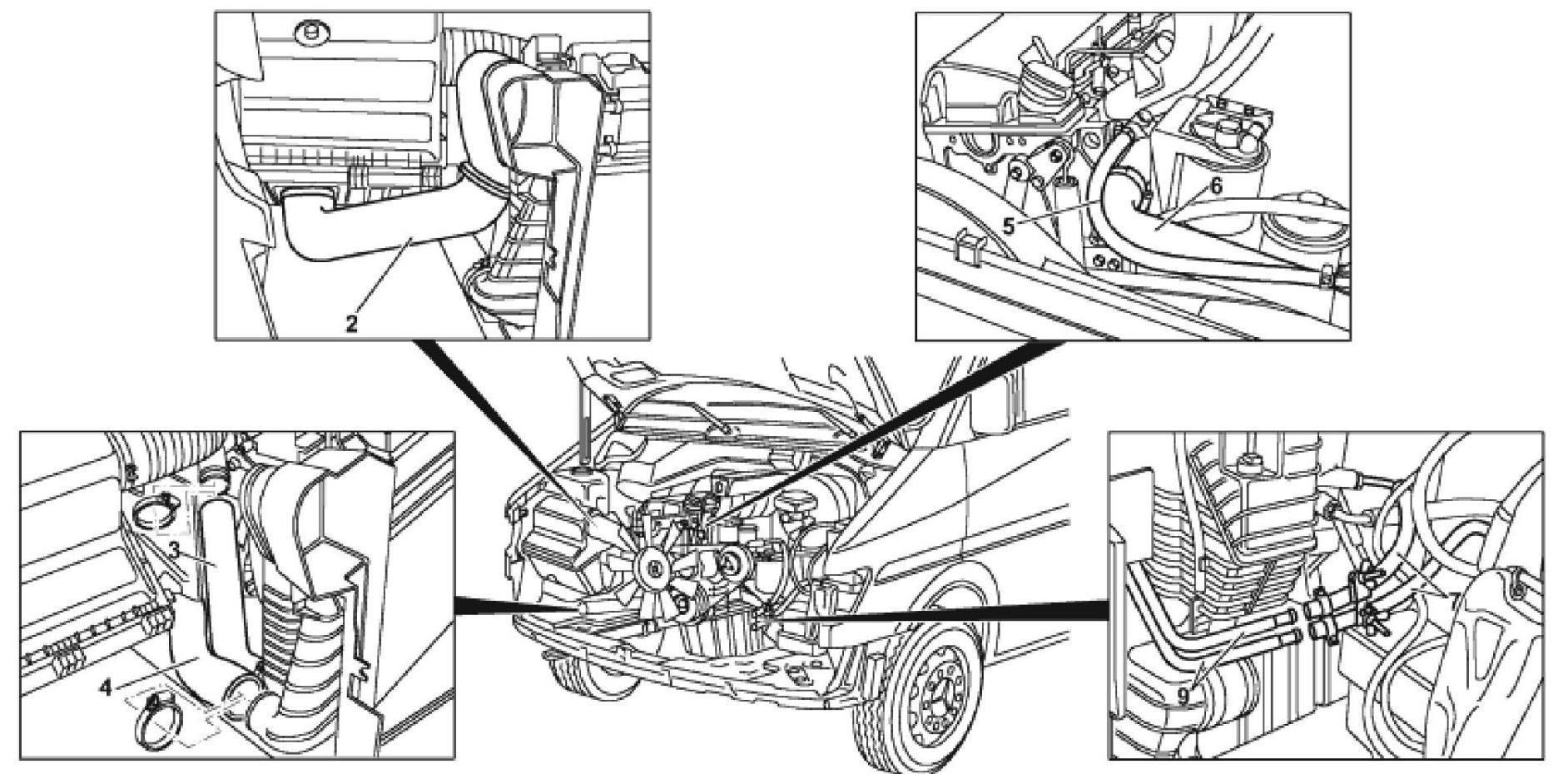 4. Detach coolant hoses (5, 6) at the coolant outlet connection