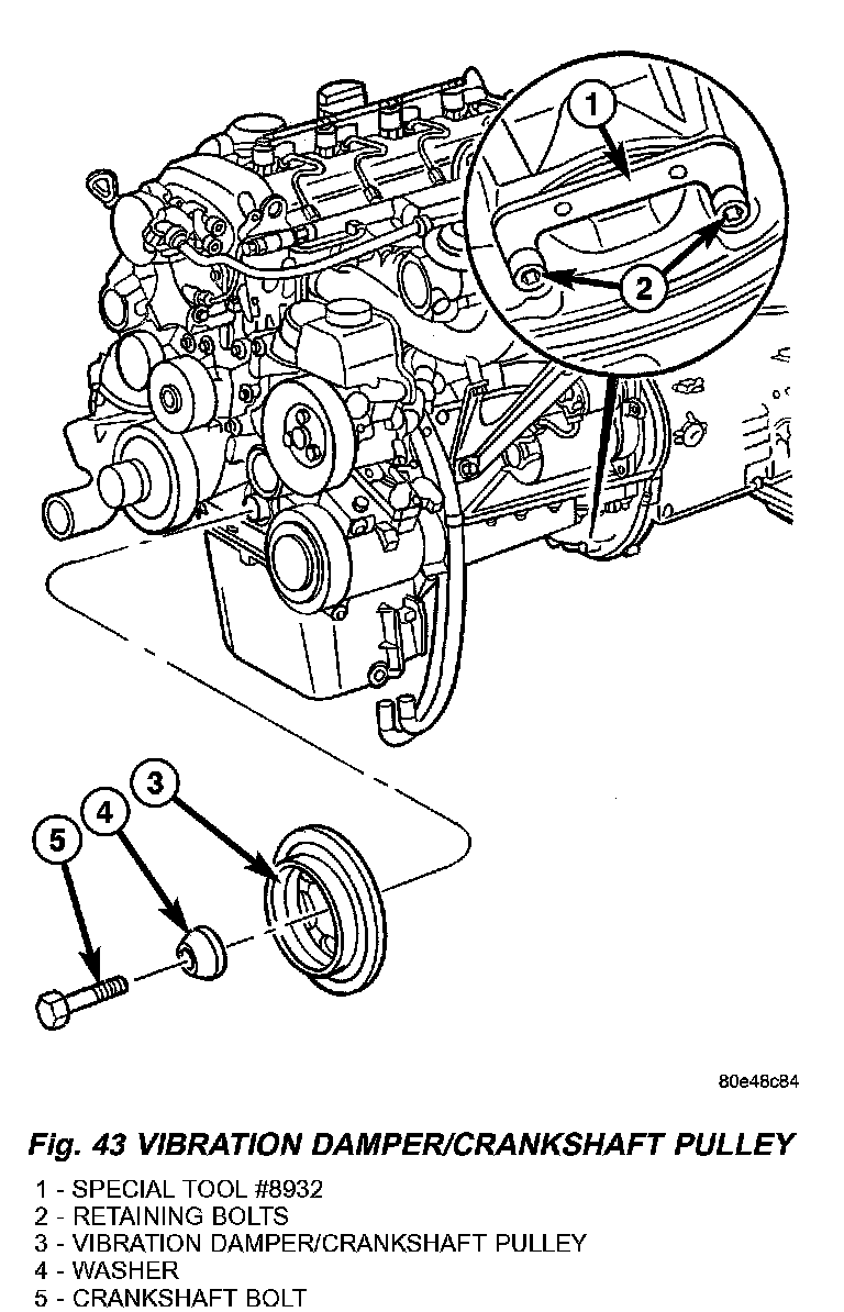 NOTE: If hub of belt pulley/vibration damper is tight, use puller # 8940 to remove. DO NOT tilt puller when in use. Grooves of the puller must mesh fully into the slots of the belt pulley.