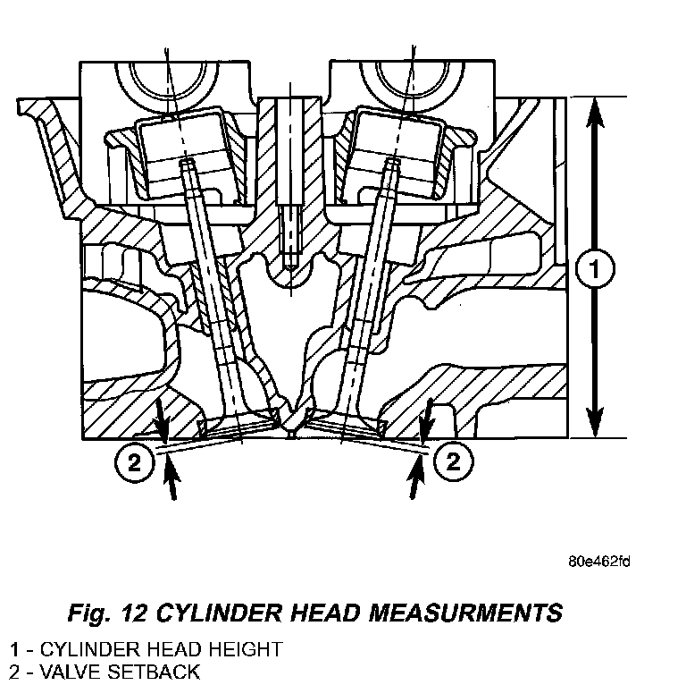 9. Measure valve setback at points (2) indicated (Fig. 12) CYLINDER HEAD SPECIFICATIONS.