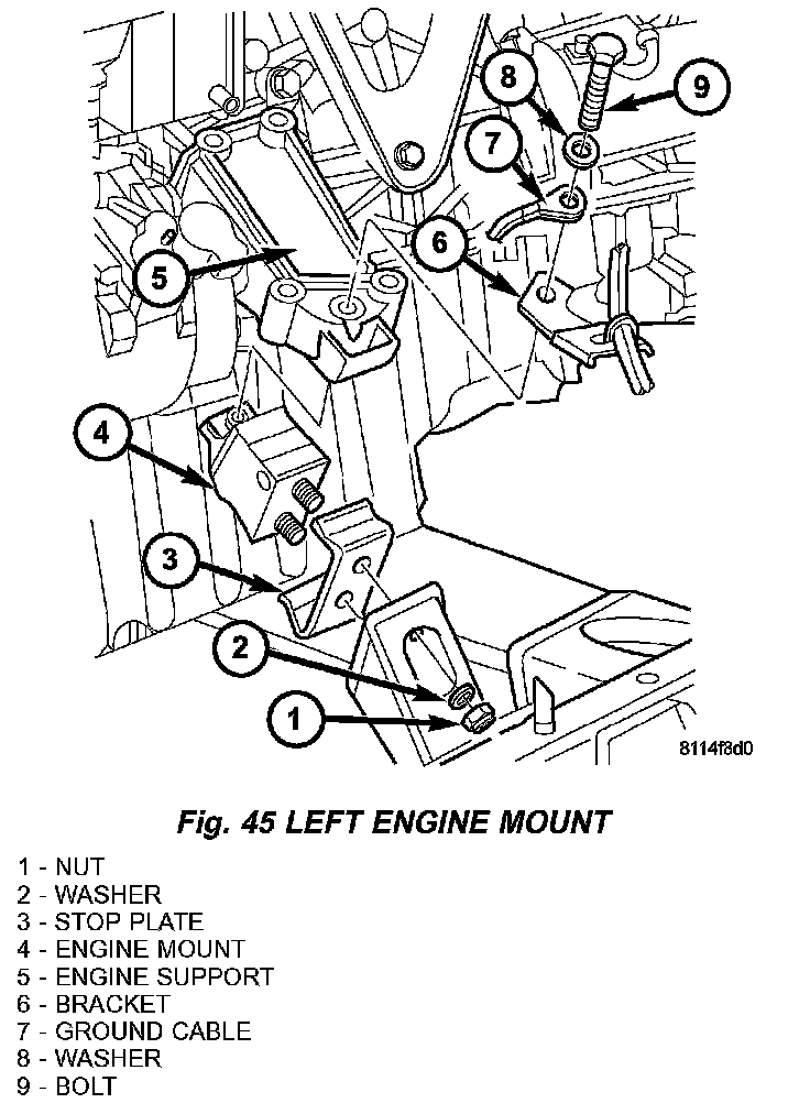 2. Position the engine mount into position and tighten the retaining nuts to 45 Nm (33 ft. lbs.) (Fig. 45)
